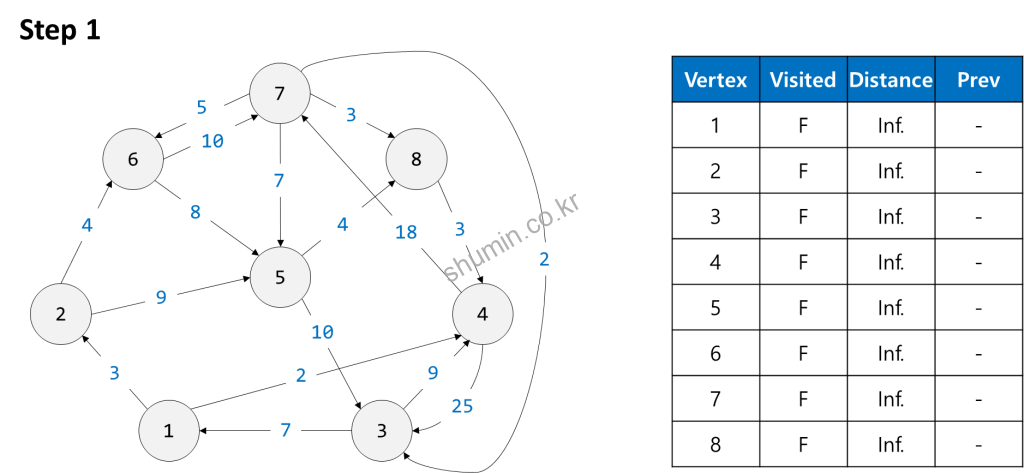 - 초기화: 아직 방문하지 않는 vertex에 대해서는 거리는 무한대, 방문 정보는 false로 초기에 설정