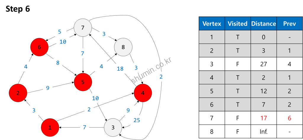 계속해서 새로 방문한 vertex 6에서 이동 가능한 vertex 5, 7을 업데이트 해주게 되는데 이미 방문한 vertex의 경우엔 기존에 기록된 거리값과 비교하여 작은 경로의 거리로 업데이트를 해주게 된다. 위 예시의 경우 vertex 7는 기존 경로는 20, 새롭게 방문된 경로는 17이기 때문에 새로운 경로의 정보로 업데이트 해준다.