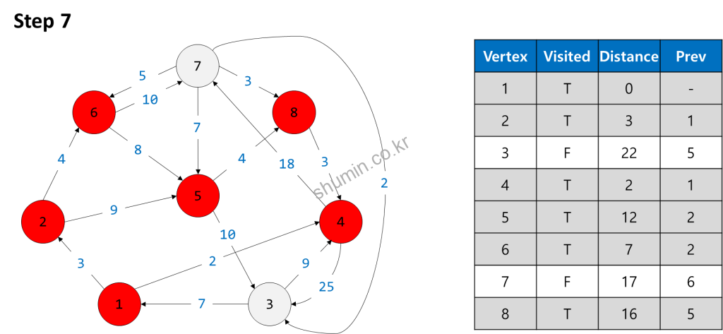 이제 다음 짧은 vertex 7을 방문해주고 이후에 vertex 3을 방문해주면 모든 vertex를 방문했기 때문에 탐색이 종료된다.