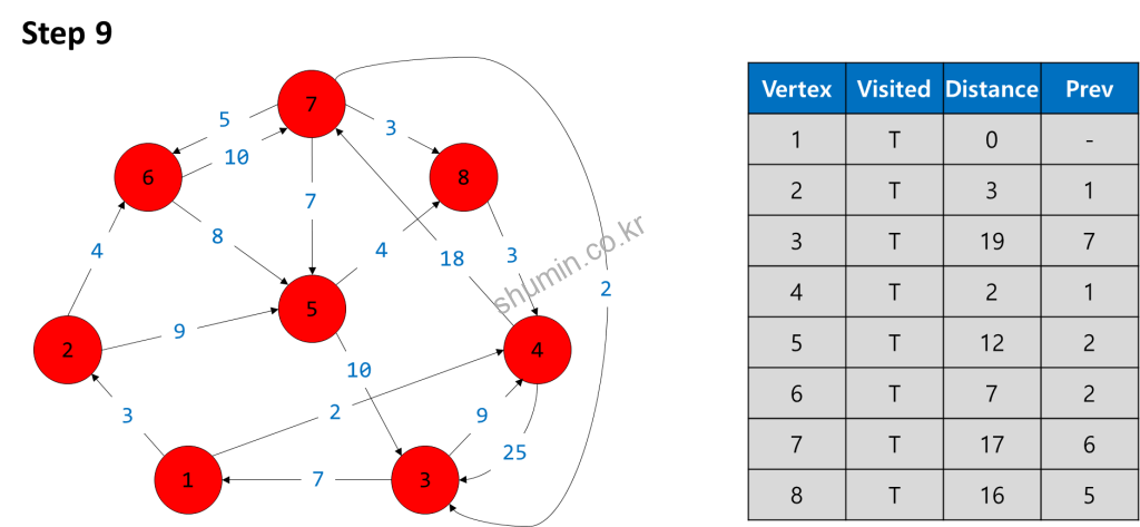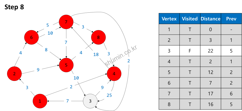 이제 vertex 5에서 3, 8을 연결이 가능한데, vertex 3의 경우에도 새롭게 방문된 경로 길이가 더 짧기 때문에 새롭게 업데이트를 해주고, 다음 짧은 경로인 vertex 8을 방문해준다.