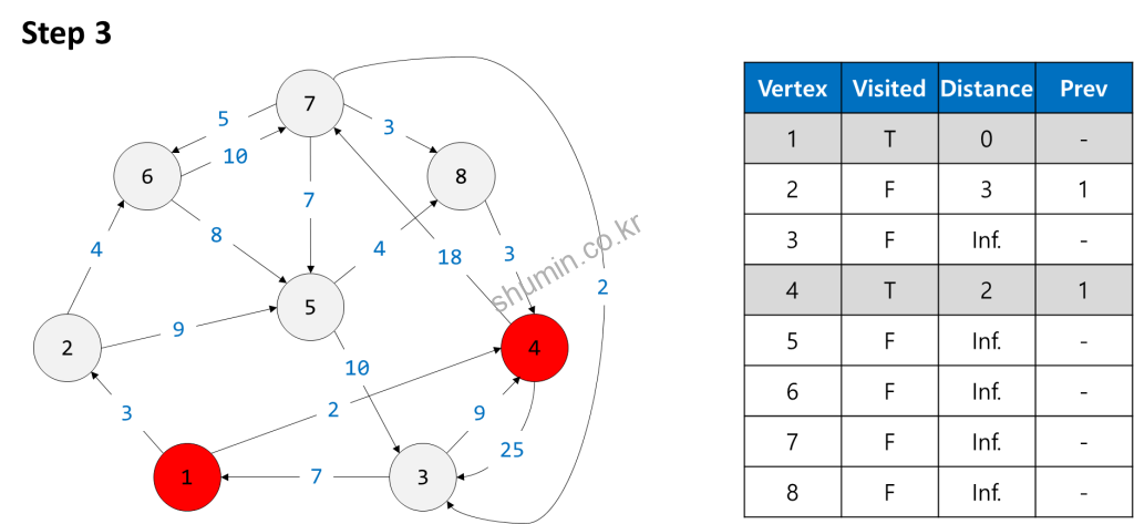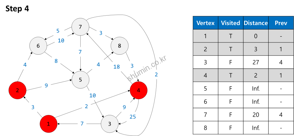 그리고 연결된 노드 정보를 table에 업데이트 해주고, 가장 가까운 노드인 vertex 4부터 방문한다.