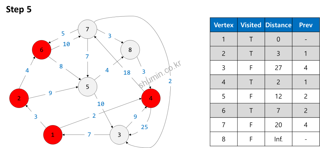 그리고 다음 가까운 노드인 vertex 5를 방문한다.