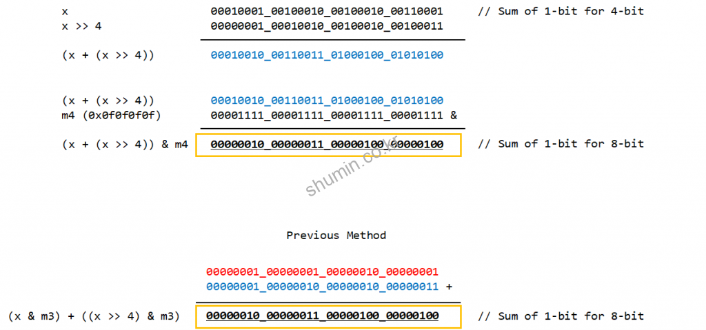 4-bit에 대한 1-bit count 방식은 동일하고, 8-bit의 경우엔 보면 약간 다른데, 기존엔 상위 4-bit masking한 값과 하위 4-bit masking한 값을 더했지만, 이번엔 따로 masking을 먼저 하지 않고 바로 상위 4-bit + 하위 4-bit을 수행시키고 난 뒤에 상위 4-bit에 대해서 모두 0으로 만들었다.