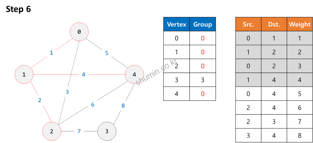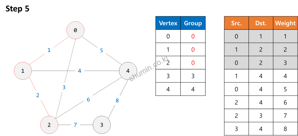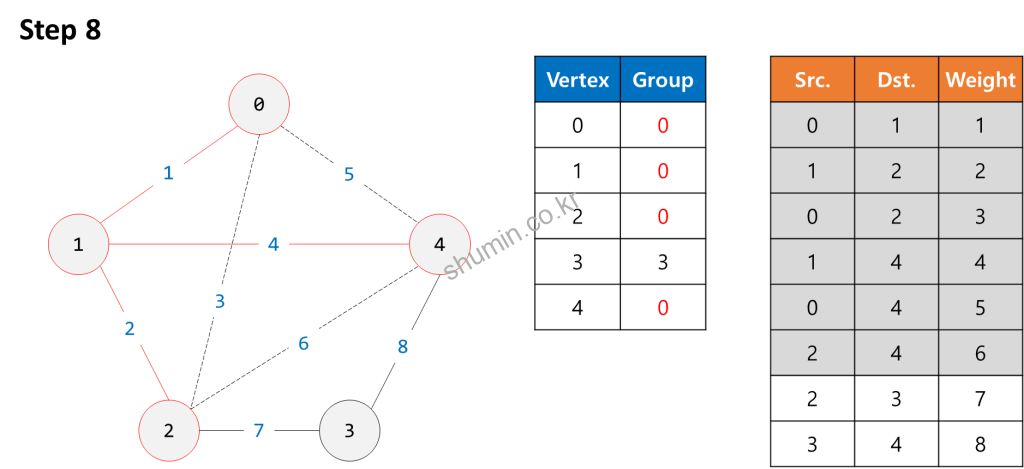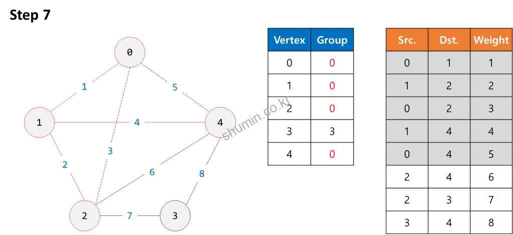 - Cycle이 발생되는지 확인 방법은 edge의 source vertex의 그룹과 종료 destination vertex의 그룹이 같으면 cycle이 발생되는 것이라 판단 가능하다.