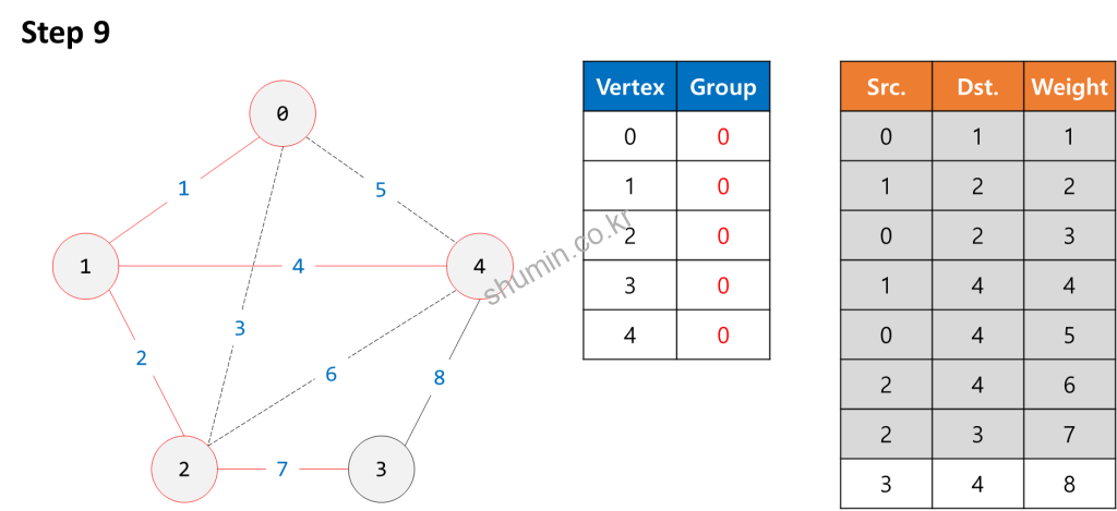 - Edge의 수가 vertex의 수보다 1개 적으면 종료한다.