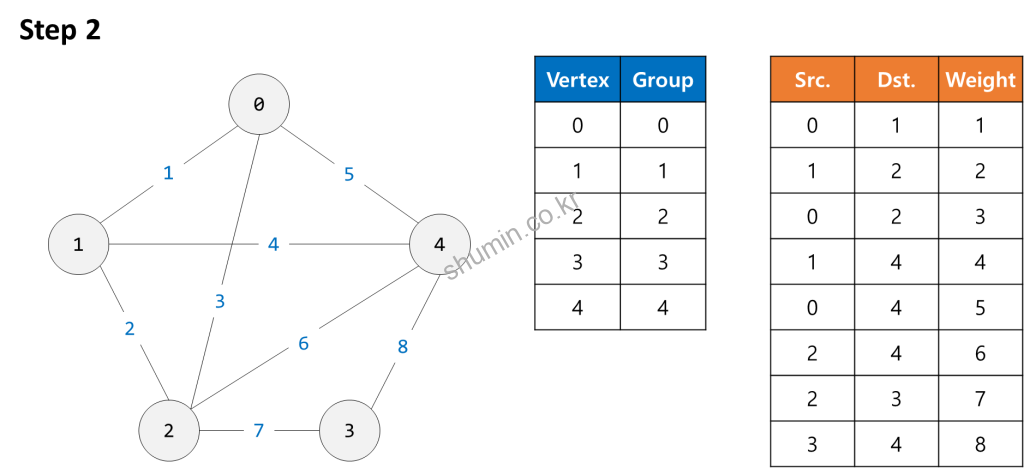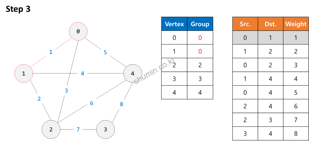 - 가장 가중치가 낮은 edge부터 추가하면서 graph를 만든다.