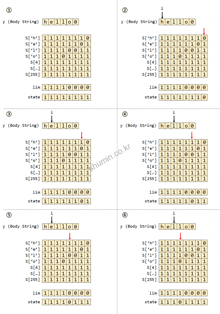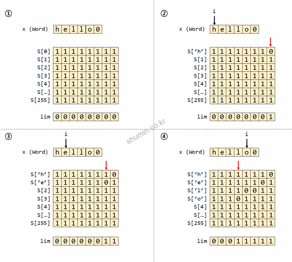 찾고자 하는 문자열의 첫 문자부터 순차적으로 lookup table에 ‘0’ 값으로 표시를 하고, lim