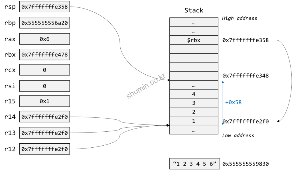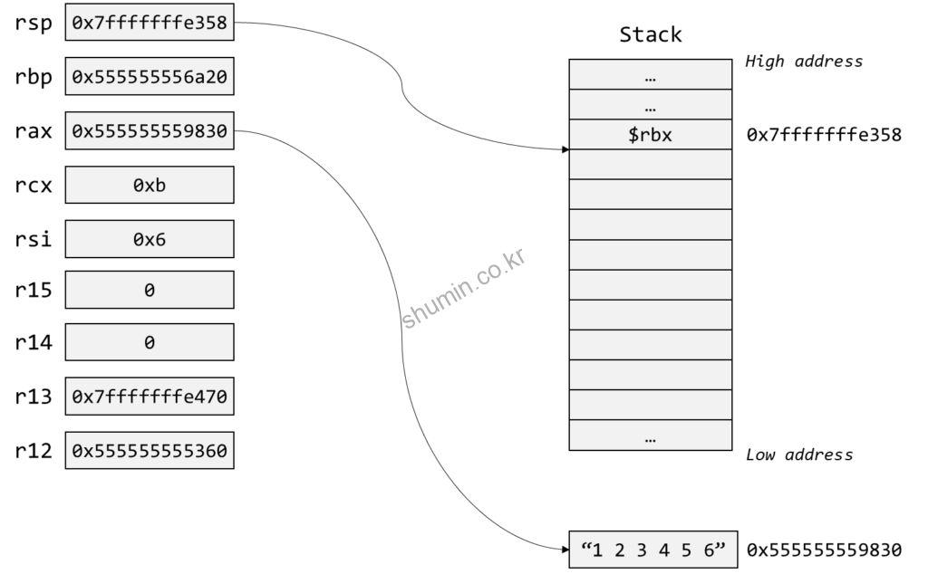 수행 직후 register 및 stack information을 보여준다. 우리가 임시로 입력한 문자열들은 $rax