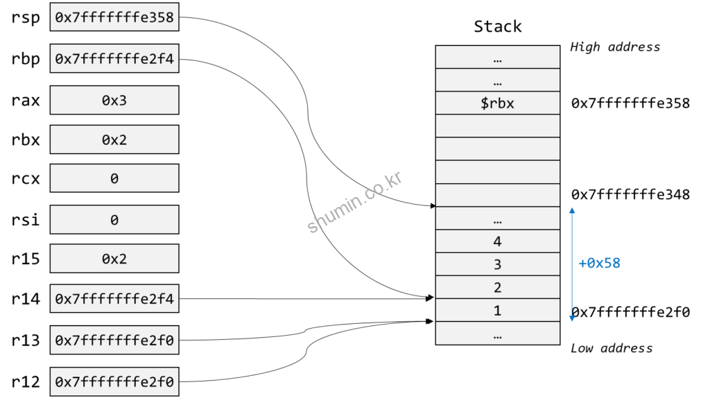 함수 수행 직후 assembly를 보면, 각종 register의 임시 값들을 stack에 저장하고 stack pointer를 변경하면서 stack memory 영역을 할당하는 것을 볼 수 있다.