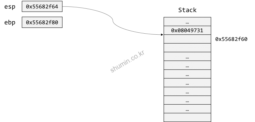 가 저장되어 있으며, 이 값은 return address를 나타내는 값으로 0x08049731