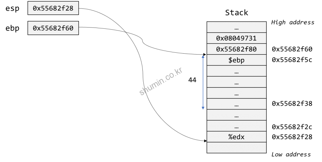 의 차이인 44 bytes 만큼의 정보를 가지고 위 문제를 해결 할 수 있다. 참고로 edx