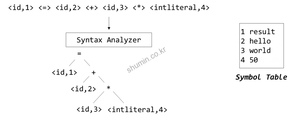 이 단계에선 lexical analyzer에서 만든 token sequence를 바탕으로 syntax가 맞는지를 확인한다. 이 때 Abstract Syntax Tree (AST) struct가 만들어진다.