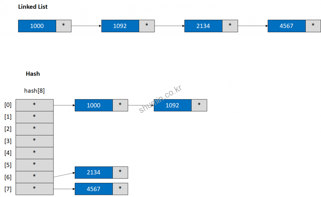 Hash에선 bucket이라는 구조가 사용되는데, hash function을 거쳐 나온 값을 통해서 bucket을 indexing하게 되며, 각 노드가 head가 되어 linked list 구조를 가진다. 이렇게 bucket을 통해서 분산배치를 할 경우 시간복잡도는 O(N / Bucket Size)가 되는데, 이는 반드시 hash function을 통해 분산배치를 시켜야지 이득이 된다.