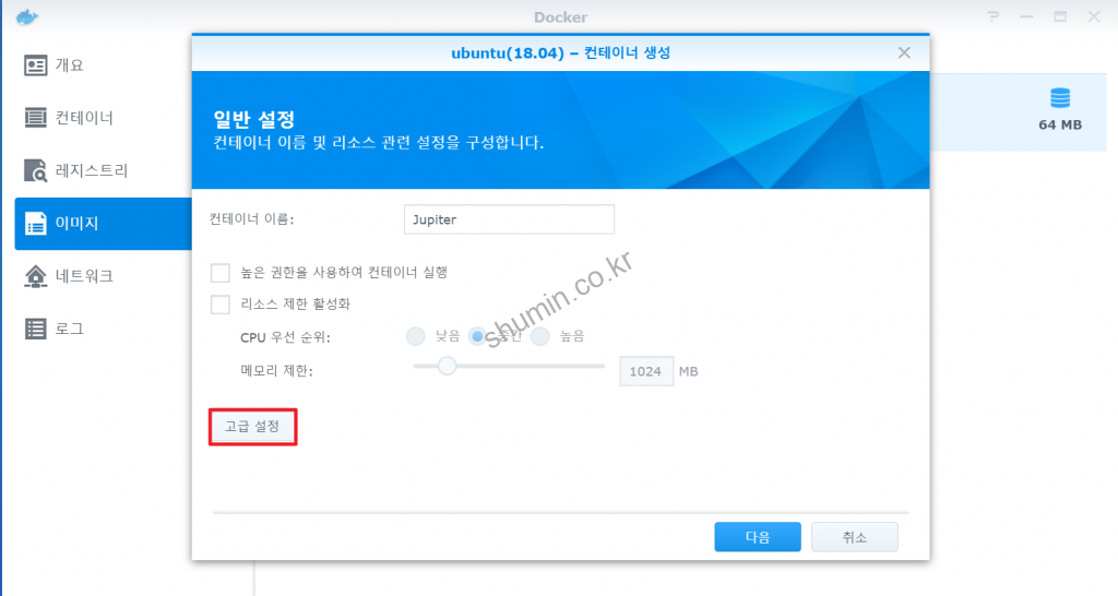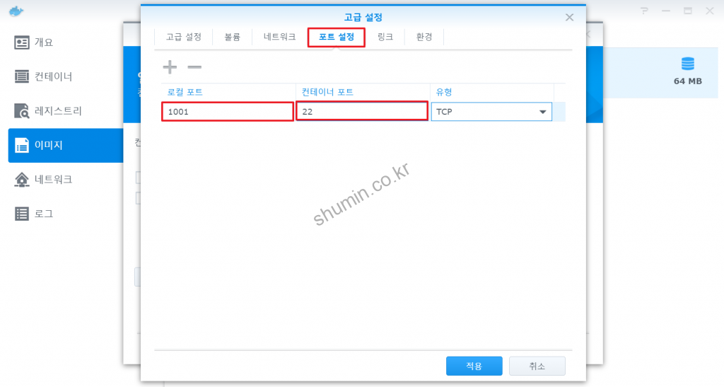 위 포트 설정은 NAS 외부 1000 포트가 실제 내부 Ubuntu 이미지의 22번 포트와 연결시키는 부분이다.