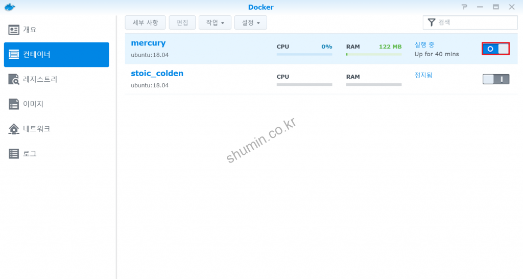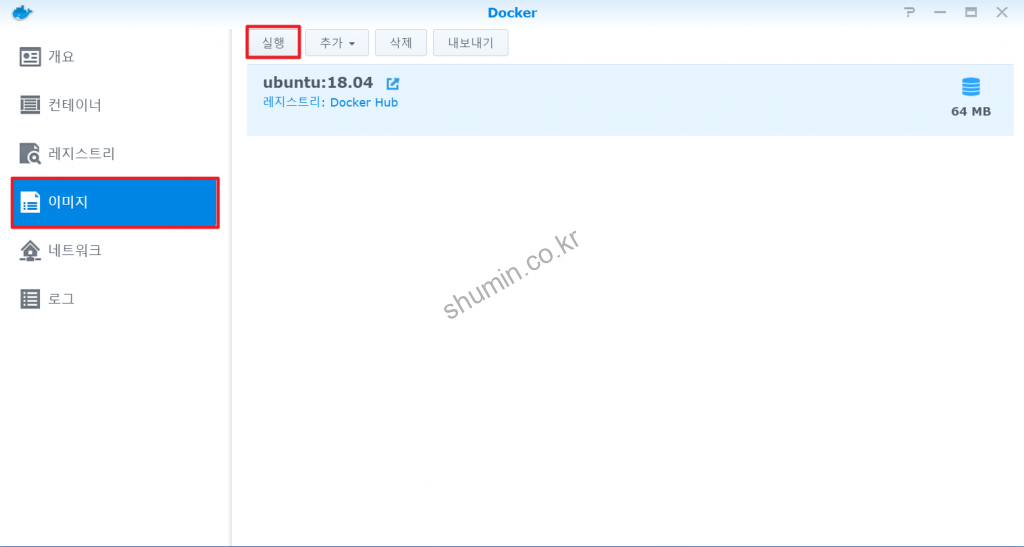 우선 기본적으로 패키지 센터에서 “Docker”를 다운받고 실행시키면 다음과 같이 된다.