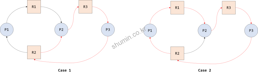 - Circular wait: 원을 그리는 형태로 process 집합이 원하는 resource를 서로 원하는 구조가 만들어져야 한다.