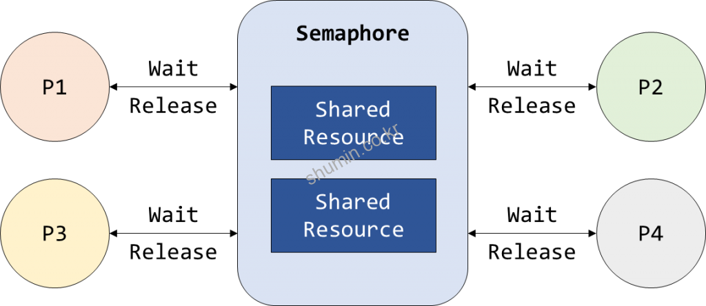 Semaphore는 Mutex와 다르게 signaling mechanism으로, 만약 shared resource에 접근 가능한 경우 resource를 free하는 process가 signaling 하면서 interrupt를 건다. 그리고 shared resource에 접근 가능한 process의 개수가 2개 이상인 경우에 semaphore를 사용한다. 이 때 반드시 resource 수는 접근 가능한 process 수보다 커야한다.