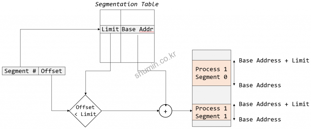Segmentation은 하나의 process를 다수의 segmentation으로 나눠서 관리한다. 각 segmentation은 base address와 limit 값으로 segment table에서 관리된다.