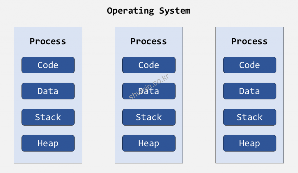 Process란 disk에 있는 program이 memory로 올라온 상태의 것을 의미한다. Process별로 code, data, stack, heap memory 영역을 가지며 하나의 CPU를 점유하여 수행하게 된다.