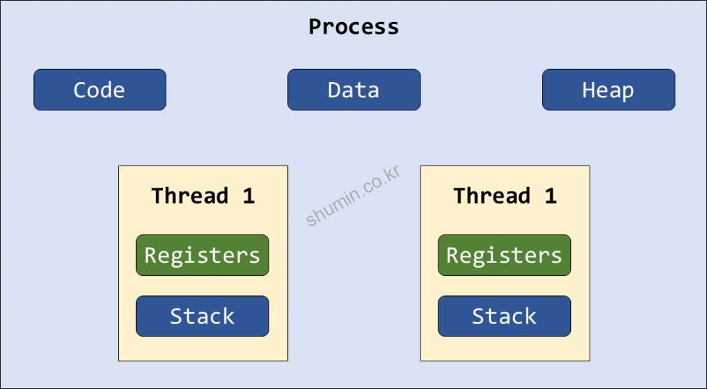 각 process에는 1개 이상의 thread가 존재하게 되는데 이를 multi-threaded program이라고 부른다. 각 thread간에는 독립적인 register, stack 정보들을 관리하게 되며, 공통적으로는 code, data, heap data를 공유하게 된다.