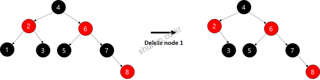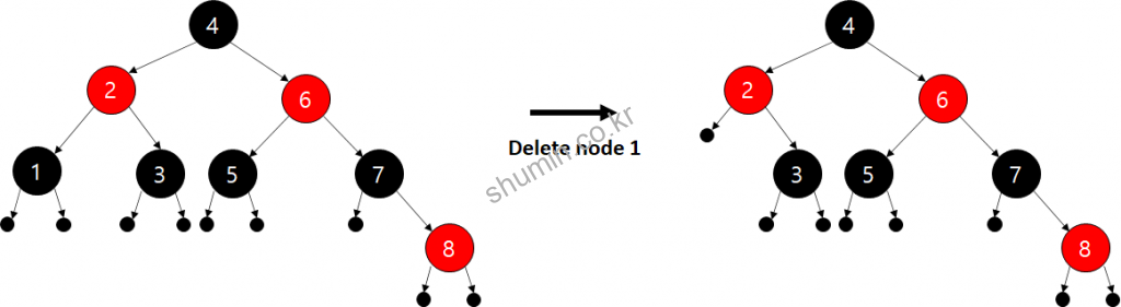 만약 아래 그림과 같은 RB tree 구조가 존재했을 때, node 1을 삭제하면 다음과 같을 것이다.
