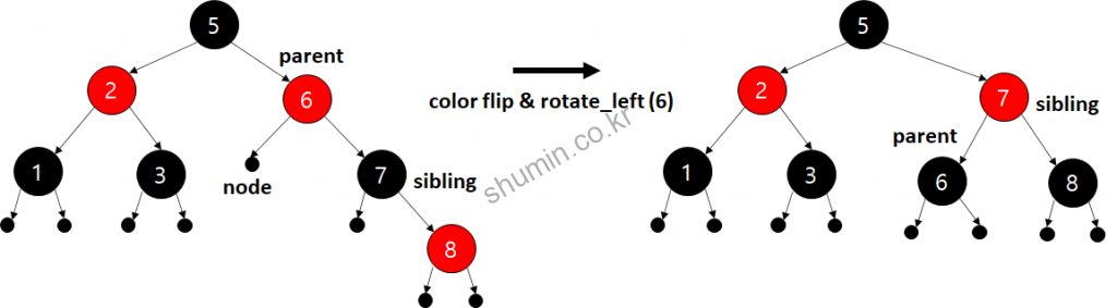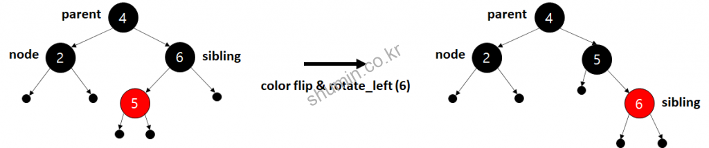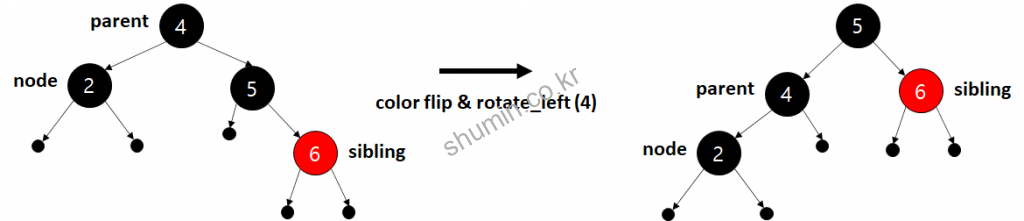 그 후에 규칙 5번에 의해서 parent를 black으로, sibling을 parent’s color로, 먼 조카를 black으로 변경하고 rotate_left를 진행한다.