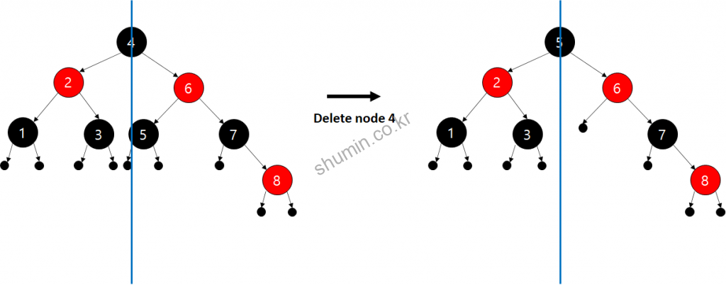 삭제하고자 하는 노드를 기준으로 오른쪽에 있는 값 중에 가장 작은 값을 후보로 올린다. 여기서 값만 옮기고, color는 옮기지 않고 그대로 사용한다.